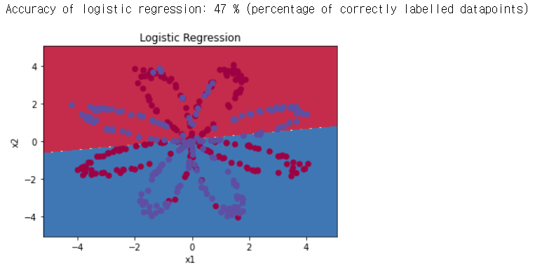 dataset이 선형적으로 구분되지 않아서, logistic regression이 잘 작동하지 않습니다. (정확도 47% 달성)