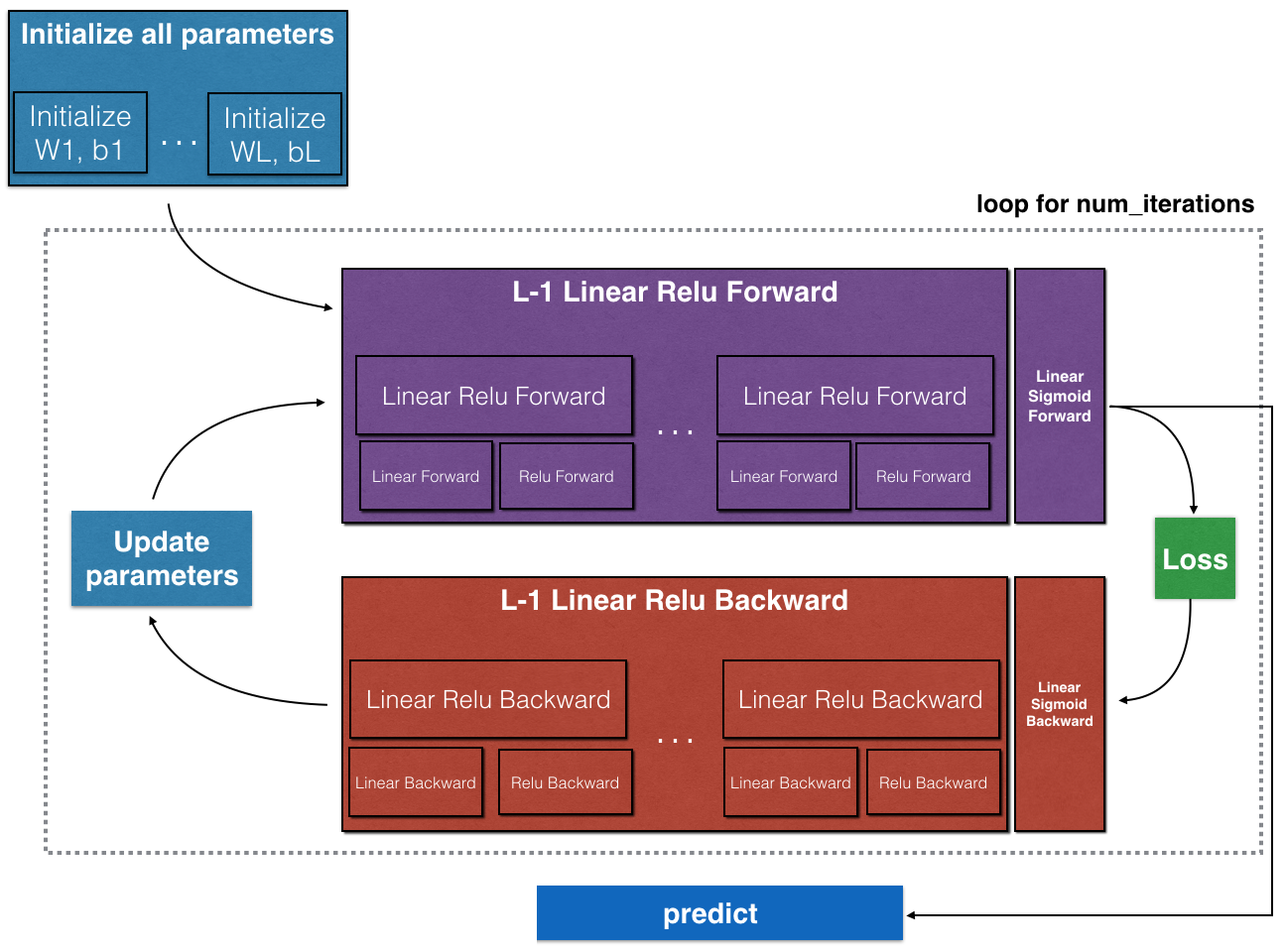 "Neural Networks and Deep Learning" (Andrew Ng)에서 지금까지 배운 내용을 바탕으로 레이어 활성화 함수로 Relu 함수를 적용하고, 출력 함수로 sigmoid 함수를 적용하는 Deep neural network를 구현하고자 합니다. 추후에 "Neural Networks and Deep Learning"을 듣게 되신다면, 정답 코드가 궁금하신 분들은 참고하시기 바랍니다.