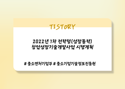 오늘은 '중소벤처기업부'와 '중소기업기술정보진흥원'가 주관하는 '2022년 1차(상반기) 전략형(성장동력) 창업성장기술개발사업 시행계획'에 대해서 알아봤습니다.