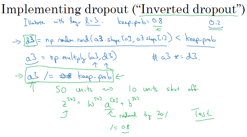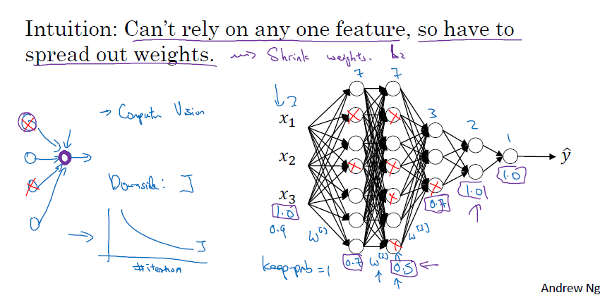 모든 시행(iteratino)에서 잘 정의된 비용 함수가 하강하는지 확인하는 게 어렵습니다. 따라서 드롭아웃을 사용하지 않고, 비용 함수가 단조 감소, 단조 증가인지 확인 후에 사용해야 합니다.