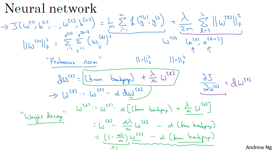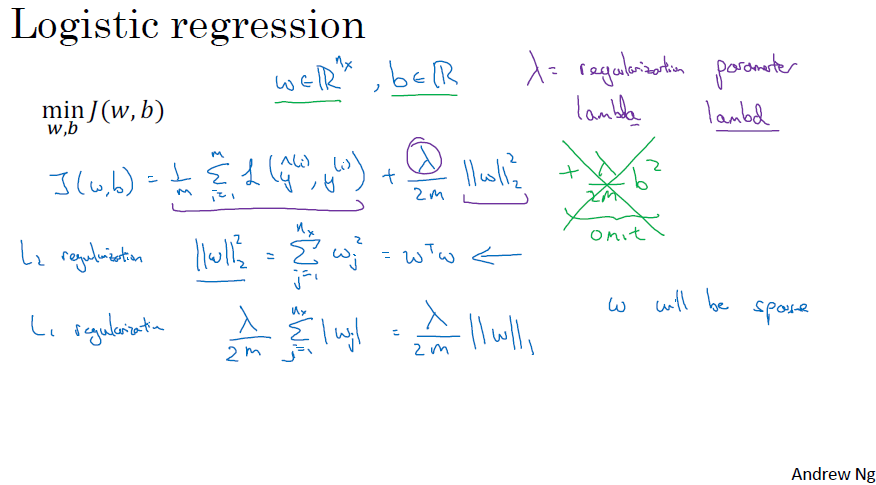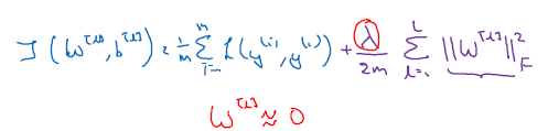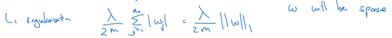L1 정규화는 딥러닝 모델을 sparse(희소) 상태로 만듭니다. (weight, w will be sparse) 이때 lambda는 일반화 파라미터 (dev set, cross validation 사용됨)로서, 딥러닝 알고리즘 개선에 조정되는 하이퍼 파라미터의 일종입니다. 추가적으로 lambda는 파이썬에서 예약어입니다.