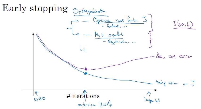 - 조기 종료는 신경망이 개발 세트의 오차 저점 부근인 '가장 잘 작동하는 점'일 때 훈련을 멈추는 것입니다.