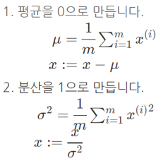 - 테스트 세트를 정규화할 때 훈련 데이터에 사용한 평균(μ)과 표준편차(σ)를 사용합니다.