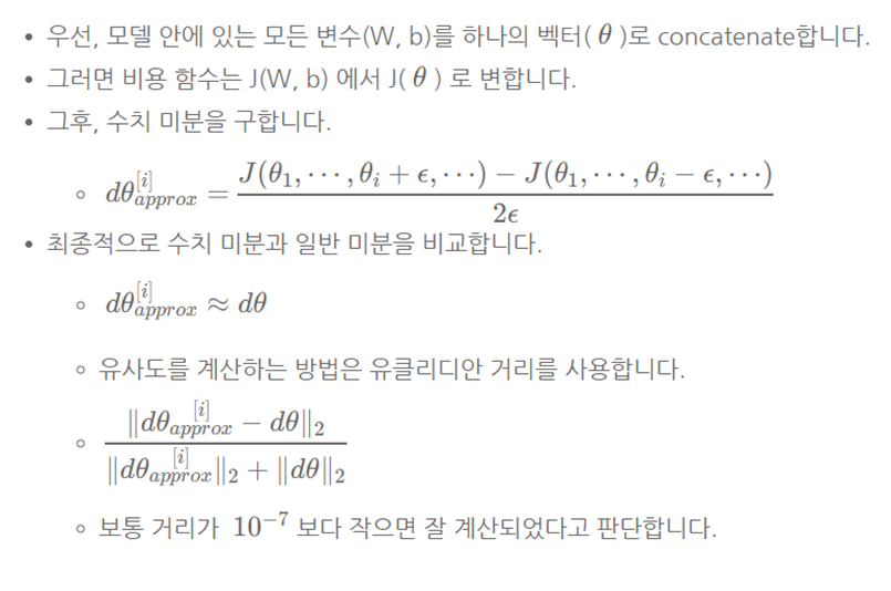경사 검사(Gradient check) 방법은 속도가 굉장히 느리기 때문에 훈련 시에는 사용하지 않고 디버깅할 때만 사용합니다.