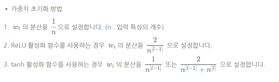 경사 소실 및 폭발을 막기 위해서 '가중치 초기화(weight initialization)'를 하고 가중치를 1보다 너무 큰 수나 너무 작은 수를 하지 않도록 해주어 폭발이나 소실을 막아줍니다. 즉, 결괏값 z가 폭발적인 값 또는 작은 값을 가지지 않기 위해서는 깊은 신경망(large n)인 경우에는 작은 가중치(smaller w)가 필요합니다
