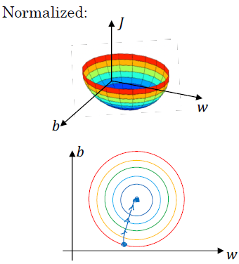 반면에 정규화를 하게 되면, 가중치(w)와 편차(b)의 관계는 정규화하지 않은 데이터에 비해 대칭적인 형태(symmetric feature)를 가집니다. 그리고 경사 하강법(gradient descent)을 적용할 경우, 적은 시행 횟수를 통해 최적화 과정이 이뤄집니다.