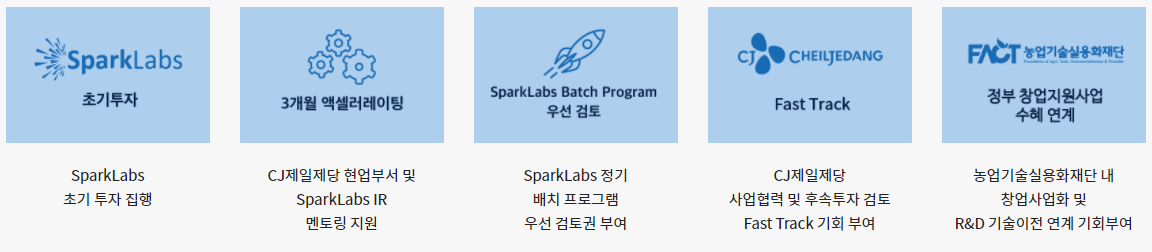 | 지원사항 | SparkLabs 초기 투자, CJ제일제당 현업부서 멘토링, SparkLabs IR 코칭 멘토링 |