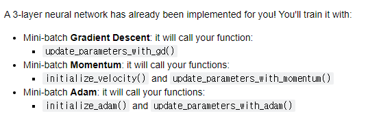 On the other hand, Adam clearly outperforms mini-batch gradient descent and Momentum. If you run the model for more epochs on this simple dataset, all three methods will lead to very good results. However, you've seen that Adam converges a lot faster.