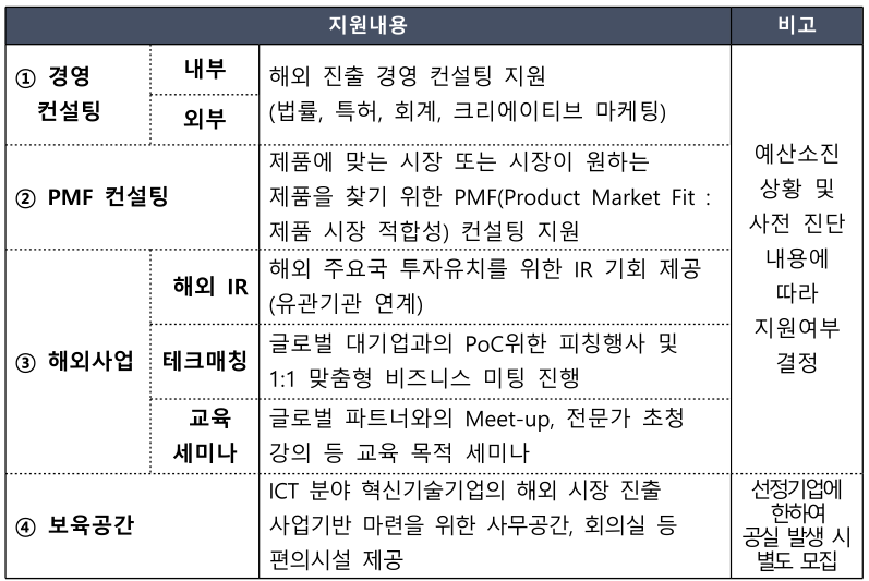 | 지원대상 | 해외 진출이 준비된 ICT 융합 기술(Data, Network, AI, 5G 등) 보유 기업 |