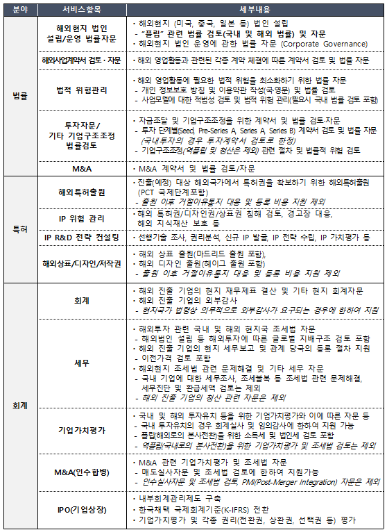 | 지원사항 | 해외진출에 필요한 현지 시장검증, 경영(전문)컨설팅 등 지원 |