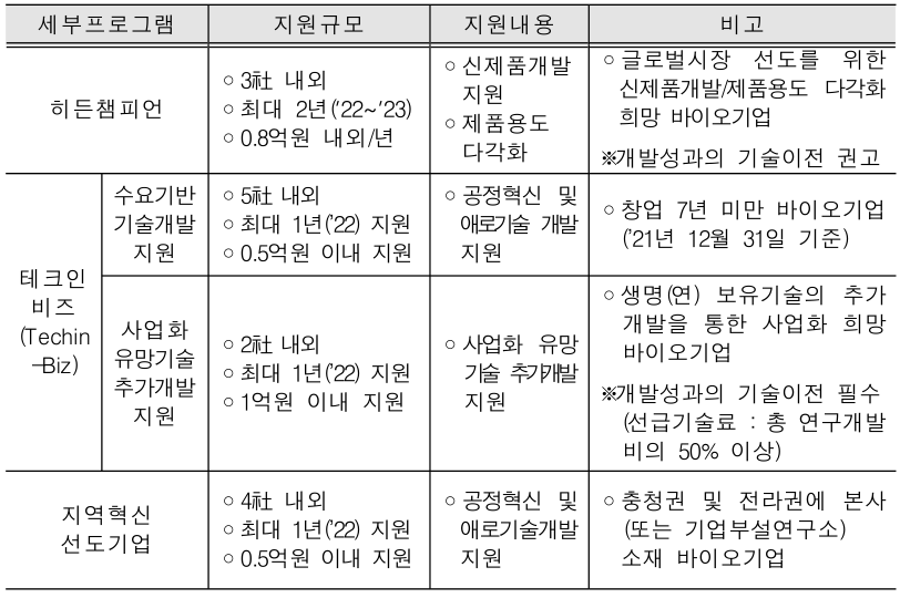 | 지원대상 | 성장잠재력이 높은 바이오 중소기업 |