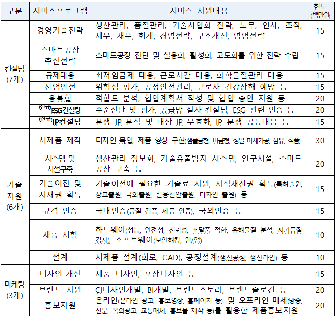 - 컨설팅, 기술지원, 마케팅 3가지 분야, 16개 프로그램을 이용할 수 있도록 바우처 형태로 제공