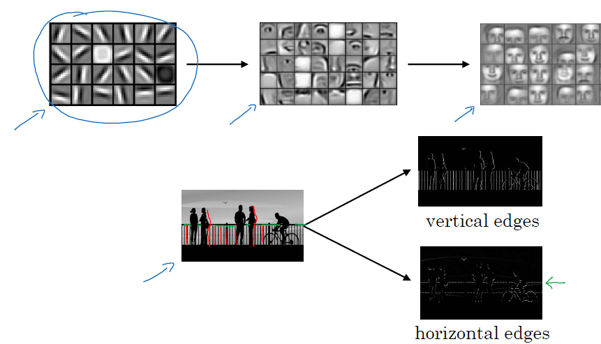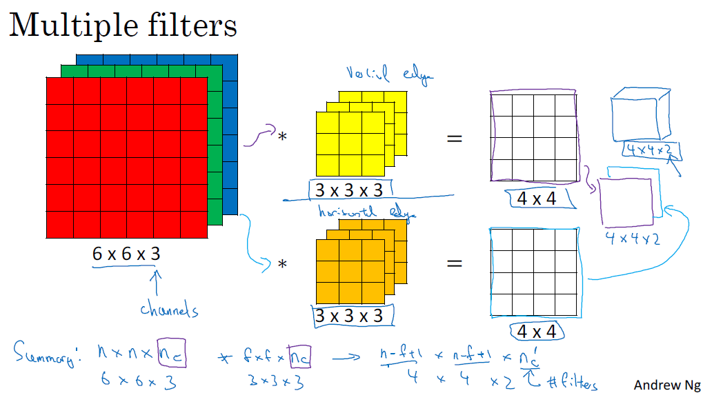 이를 정리하면 Nc' 필터 개수의 output volume이 됩니다. 이렇게 multiple filter의 장점은 수평, 수직 또는 수백 가지의 서로 다른 feature를 감지할 수 있는 점입니다.