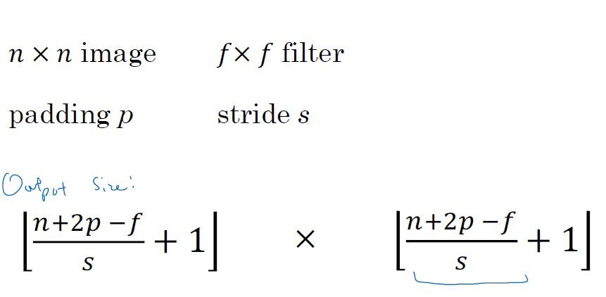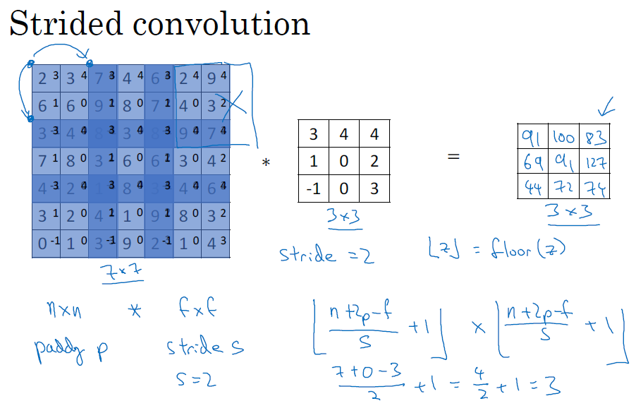 stridded를 적용한 결괏값 레이어는 "(n+2p-f)/s + 1의 내림"으로 계산됩니다.