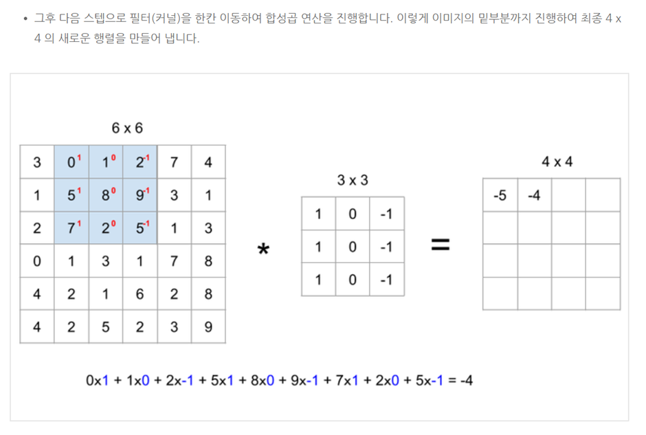 계산 방식은 아래 그림처럼 3x3x3을 RGB에 대응하여 곱하고, 이를 더한 값을 output metrics에 작성합니다. 이를 한 칸씩 이동하면서 반복해서 진행합니다.