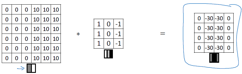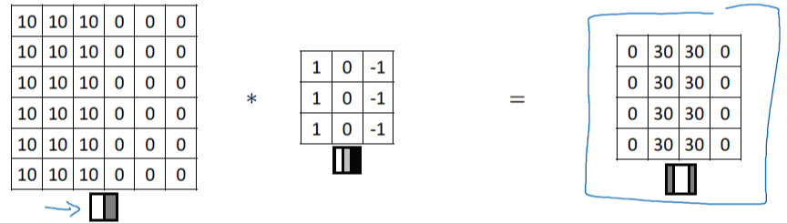 feature들이 필터에 감지되면 이를 입력하고, 감지되지 않으면 입력하지 않는 방법으로 직관적으로 feature의 분포를 확인할 수 있습니다. 위에서 정리한 내용을 바탕으로 5x5 input layer에 3x3 filter에 stride 1을 적용하면, output은 3x3 layer가 나옵니다.