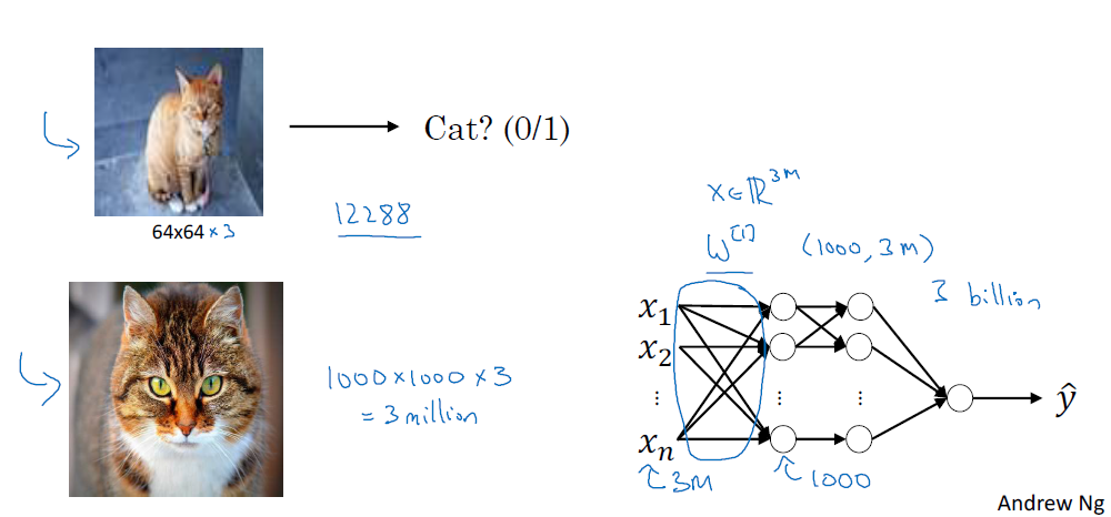 300만 입력값(xn의 개수)에 따라 첫 번째 은닉층에는 1,000개의 unit이 있으며, 그럼 총 무게가 w1 metrics입니다. 결론적으로 1,000 * 1,000 * 3으로 3M으로 파라미터를 가지게 됩니다. 이처럼 대용량 이미지인 고차원 훈련에 대해서 새롭게 훈련 모델을 설정할 필요가 있으며, CNN Convolutional Neural Network을 통해 해결할 수 있습니다.
