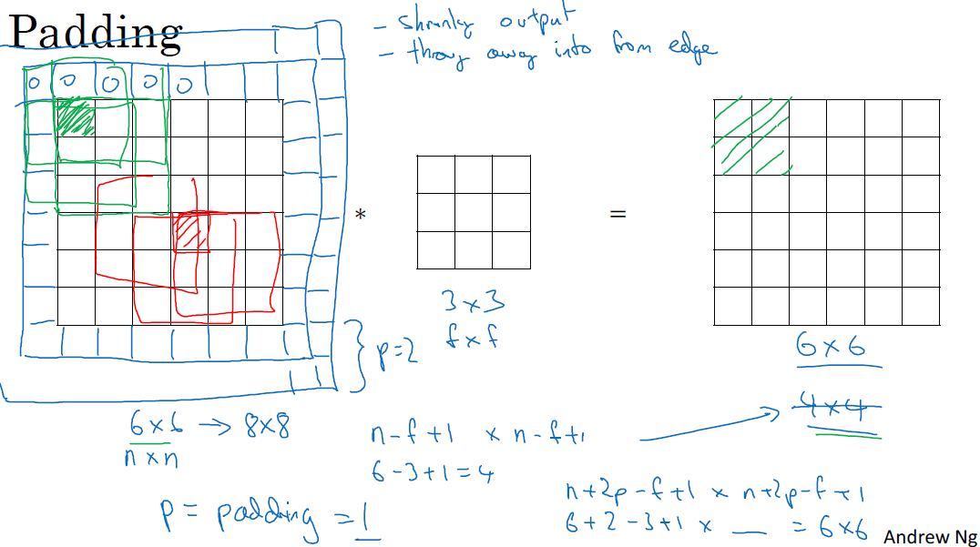 (필터 적용 전과 후의 이미지 사이즈가 똑같으려면 n + 2p – f + 1 = n을 만족하면 되며, padding size인 p = (f-1) / 2로 정하면 됩니다.)