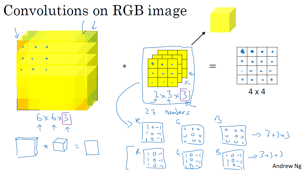 이렇게 하게 되면 색상에 대해서 감지하는 필터를 만들 수 있습니다. 결괏값은 동일한 채널인 input volume과 convolution volume을 2차원의 metrics로 반환해줍니다.