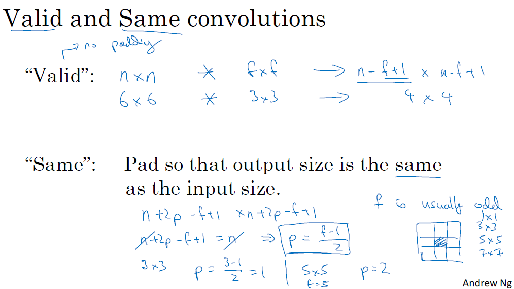 f가 홀수이면 인풋 사이즈와 아웃풋 사이즈가 동일하게 설정할 수 있습니다. 이는 f가 짝수이면 비대칭적 훈련이 진행되고, 홀수로 진행할 때 중앙값을 활용하여 대칭을 이루는 게 계산에 용이합니다.