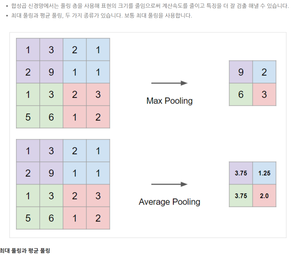 max pooling과 동일하게 filter를 적용하지만, 최댓값이 아닌 평균값을 적용합니다. 신경망에서는 max pooling 보다는 average pooling을 많이 사용합니다.
