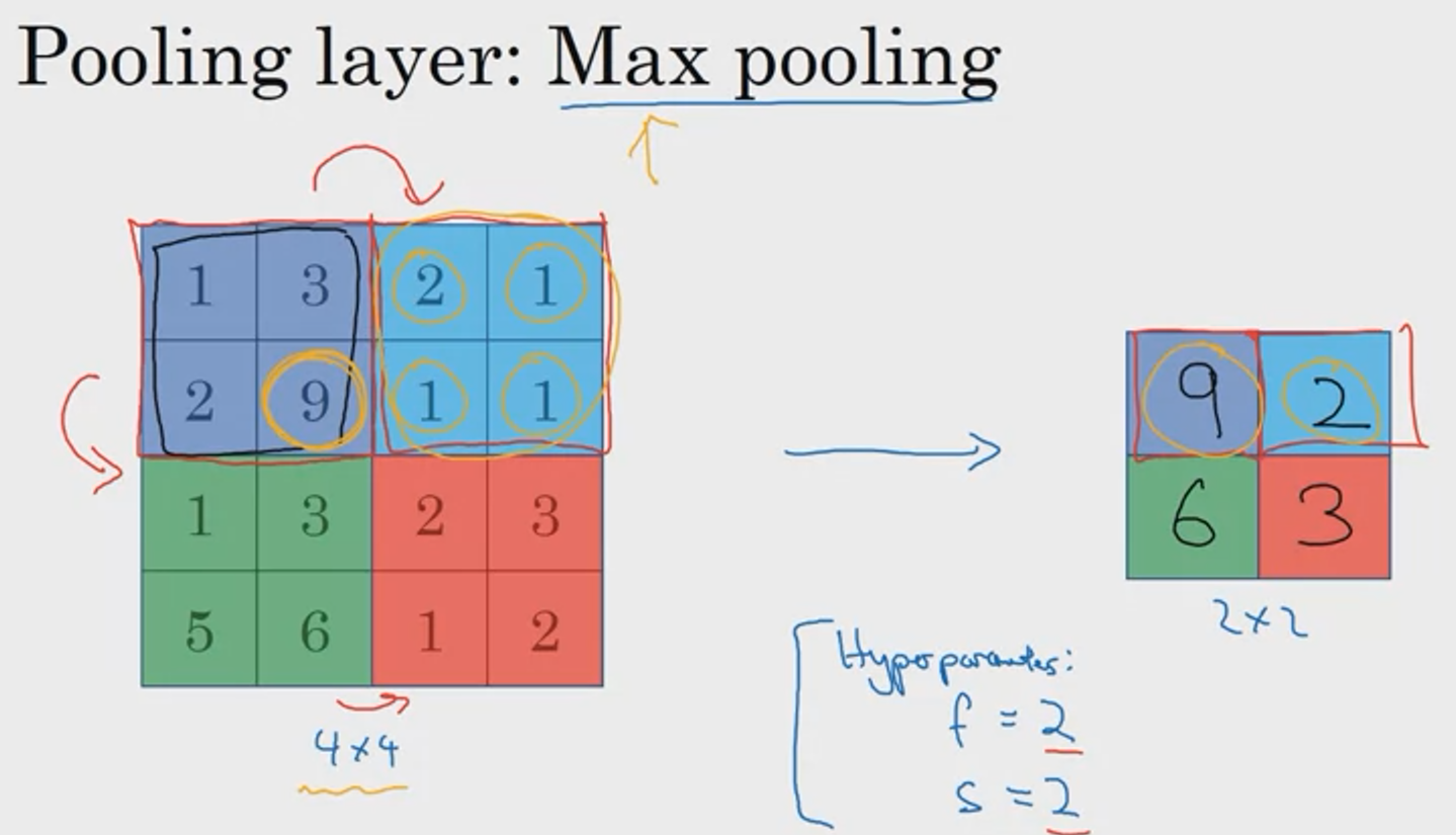 metrics를 구역으로 나눠서 '최댓값'을 filter에 적용합니다. 아래 예시는 4x4 metrics에서 stride 2만큼 이동하여 2x2 filter에 적용한 것입니다. Max pooling에 하이퍼파라미터는 필터 크기인 filter size, f와 이동 범위인 stride, s입니다. 이때 output layer에 크기는 convolution operation과 동일하게 [(n+2p-f)/s + 1]의 내림과 동일합니다.