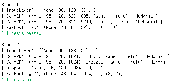 Each conv_block() is composed of 2 Conv2D layers with ReLU activations. We will apply Dropout, and MaxPooling2D to some conv_blocks, as you will verify in the following sections, specifically to the last two blocks of the downsampling.