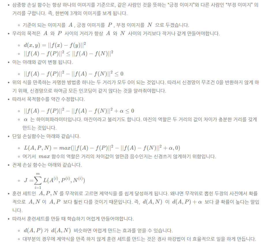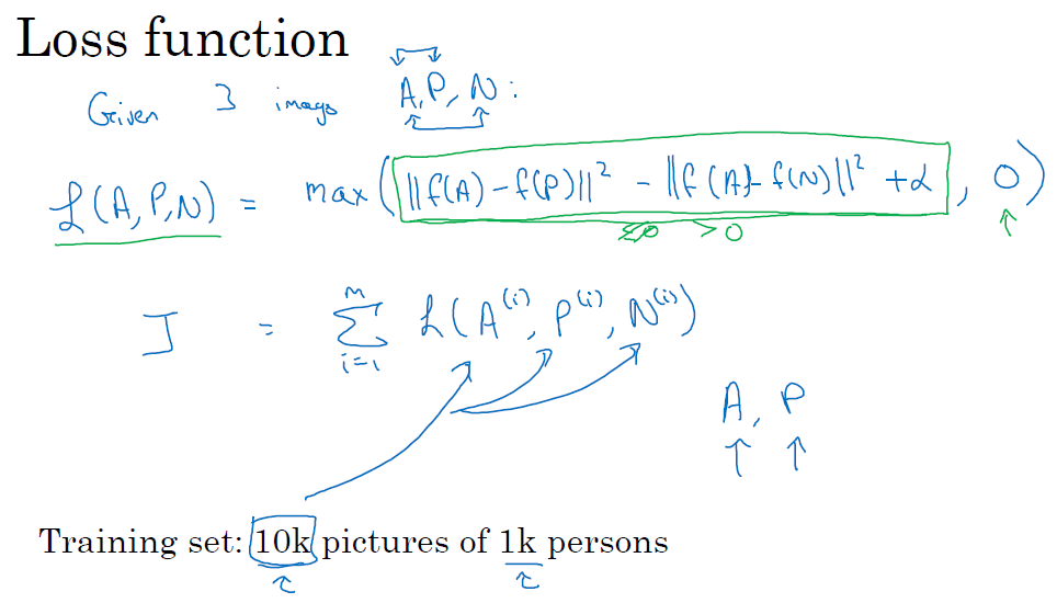 triplet loss는 세 가지 이미지, A, P, N의 비용 함수를 구합니다.
