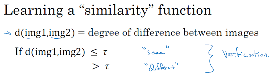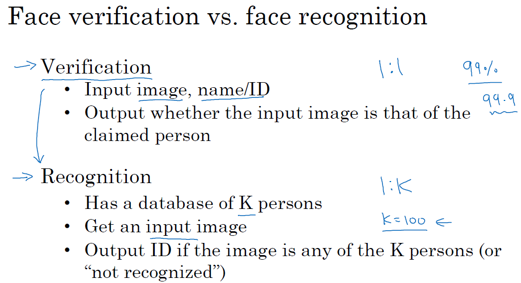 - face verification: input image를 맞는지 확인 (1:1 문제)