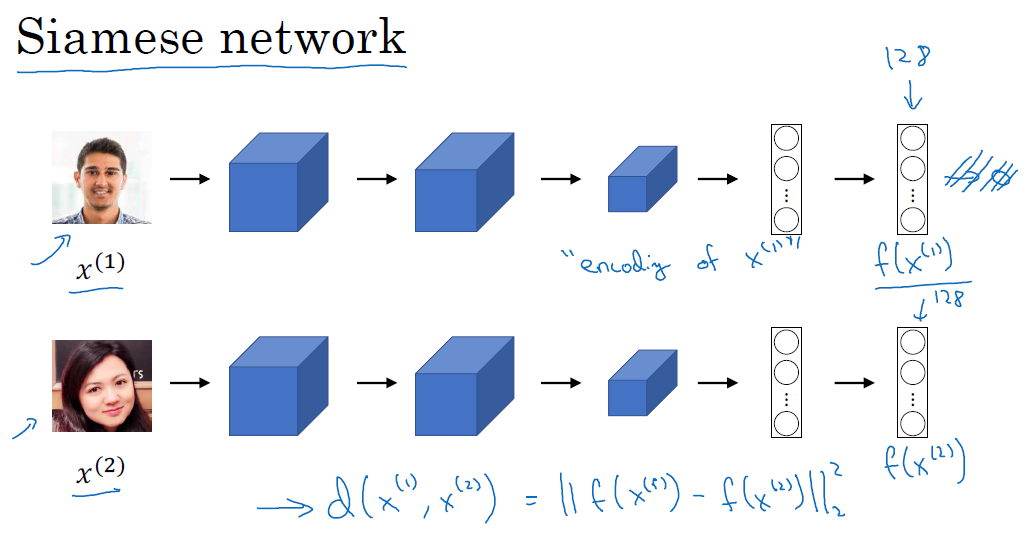서로 다른 두 개의 input에 동일한 convolution network를 실행한 다음에 두 개의 결괏값을 비교하는 것을 siamese 신경망 아키텍처라고 부르기도 합니다.