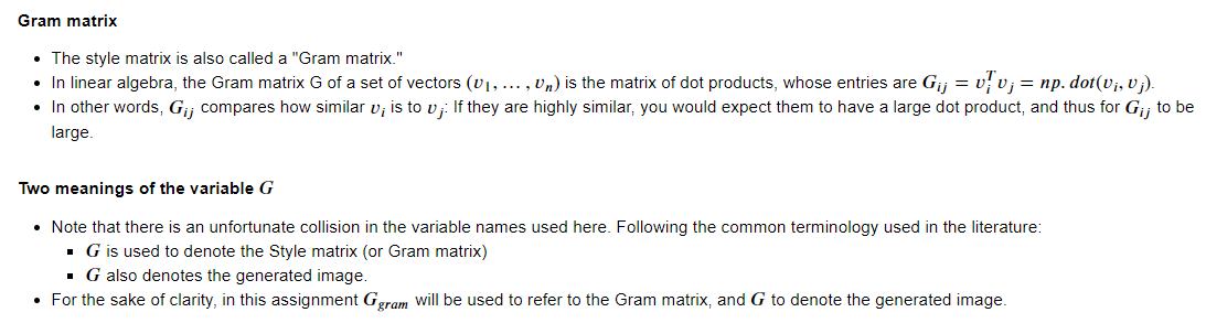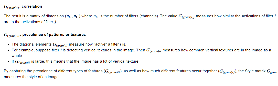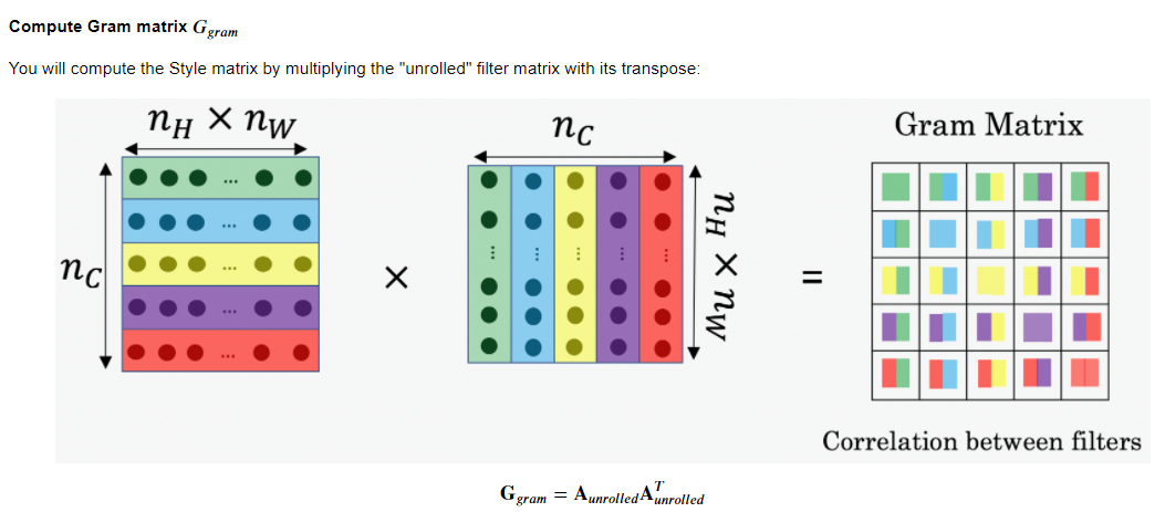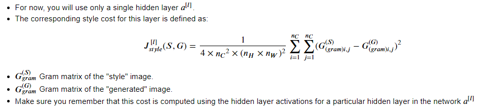 - The style cost function for one layer is computed using the Gram matrix of that layer's activations. The overall style cost function is obtained using several hidden layers.
