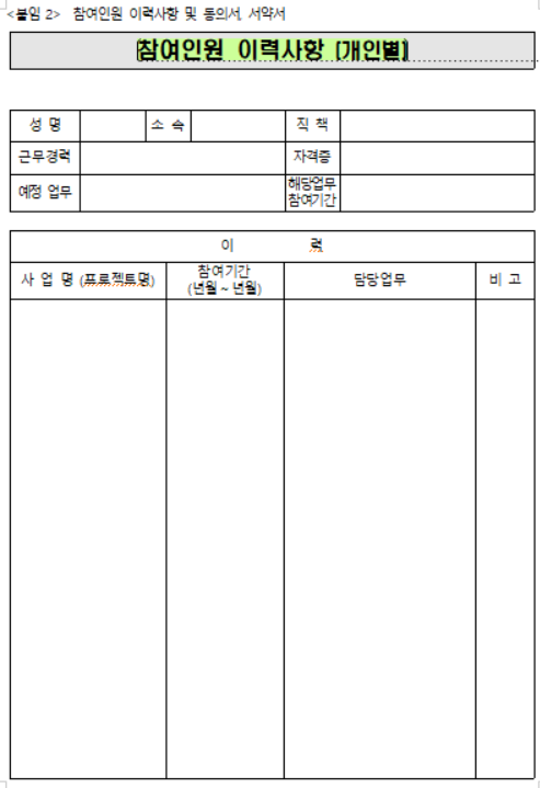 △ 제출서류 사항 중 특이사항으로는 참여인력의 프로젝트 이력사항에 대한 상세 기술이 요구됩니다. 참여인력에 대해 각각의 이력사항이 필요하기에, 시간에 촉박하여 제출하게 될 때, 누락되는 부분이 발생하기에 사전에 준비하는 것을 제안드립니다.