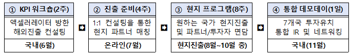 지원사항 | 해외진출 프로그램 및 해외진출자금 60백만원 지원 |