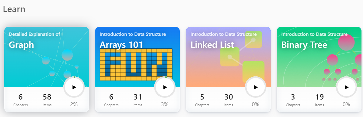 그리고 페이지에서 기초 알고리즘을 정리한 Learn 카드로 공부할 수 있습니다. 이때 알고리즘에 대한 설명과 함께 코드를 연습하면서 문제를 풀 수 있어서, 내용 정리 및 이해에 큰 도움이 됩니다.