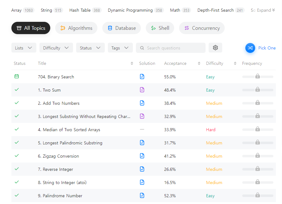 이때, Difficulty를 통해 Easy 난이도로 정렬할 수 있습니다. 처음 공부하게 되면, 문제에 대해 적응이 필요하기에 순서대로 문제를 풀기보다는 난이도 설정을 통해 문제에 대해 이해도 및 감을 올리는 방향으로 공부하는 것을 추천드립니다.