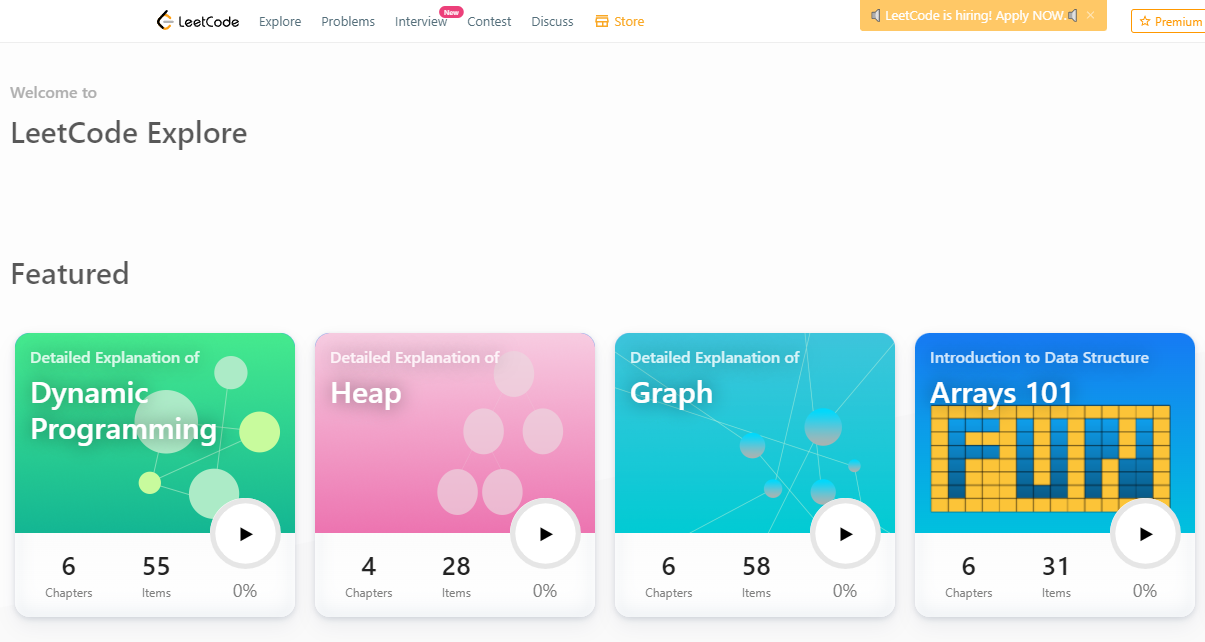 우선, 홈페이지 접속 시 상단의 Explore를 클릭하면, 아래와 같이 Leetcode Explore란 페이지로 연결됩니다.