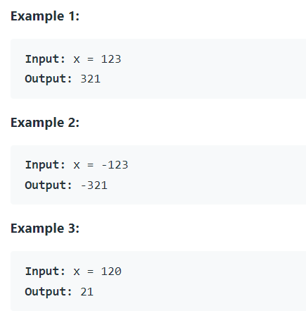 32비트 정수 x가 주어지면 숫자를 반대로 입력한 x를 반환합니다. x를 반대로 한 값이 32비트 정수 범위 [-2**31, 2**31 - 1]를 벗어나면 0을 반환합니다.