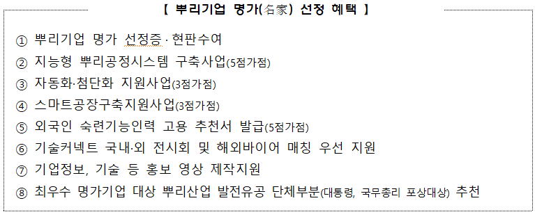 △ 지원사항: 명가 선정증, 현판수여, 뿌리기업 지원 사업 가점, 기업 홍보자료 제작 및 뿌리산업 발전 유공 단체 부분 추천 등의 기업 지원
