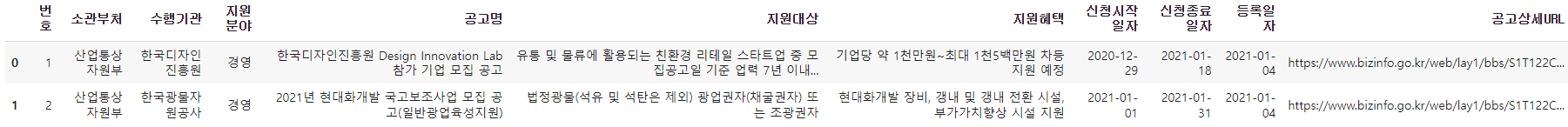 2022.04.10 - [DATA_SCIENCE/Python] - [PYTHON] 기업마당_정부 지원 사업 자동화 수집 (크롤링)