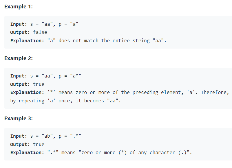 입력 문자열과 패턴 p가 주어지면 '.'와 '*'를 지원하는 정규 표현식의 일치 여부를 판단합니다.