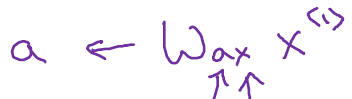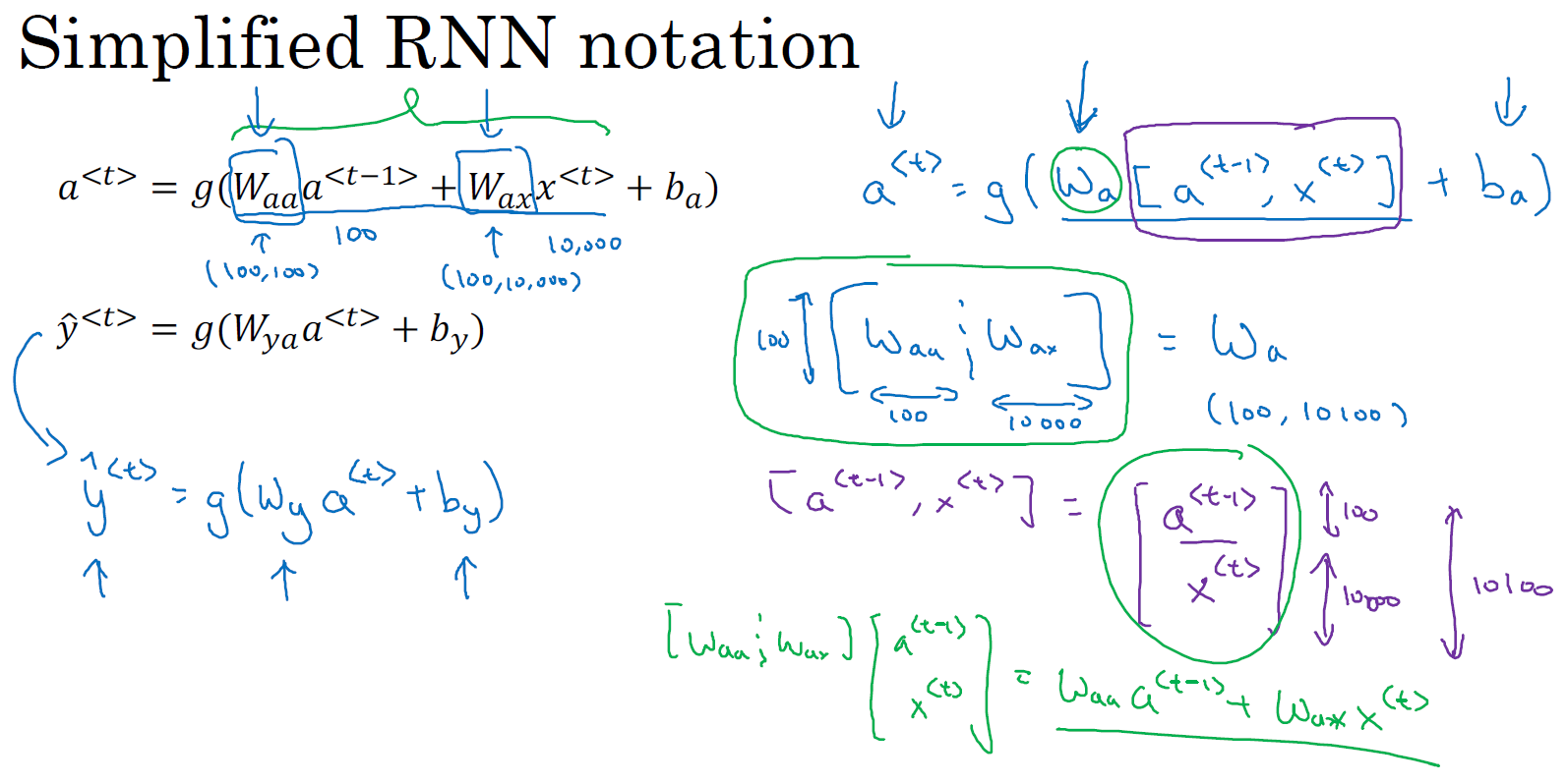 각 시점 단계에서 파라미터를 공유합니다. (Wax, Waa, Wya) 이때 표기법은 Wax를 예를 들어, W는 가중치를 의미하며, 아래첨자 x는 곱해지는 대상을 나타내고, 아래첨자 a는 산출되는 대상(a)을 의미합니다.