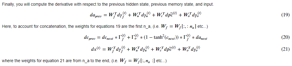 da_prev = np.dot(parameters['Wf'][:, :n_a].T, dft) + np.dot(parameters['Wi'][:, :n_a].T, dit) + np.dot(parameters['Wc'][:, :n_a].T, dcct) + np.dot(parameters['Wo'][:, :n_a].T, dot)