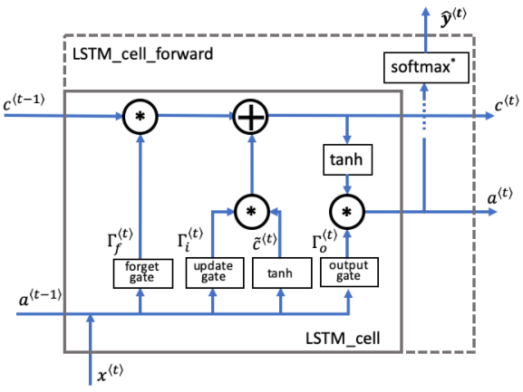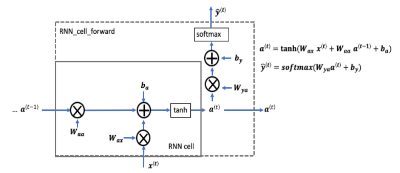 You can think of the recurrent neural network as the repeated use of a single cell. First, you'll implement the computations for a single time step. The following figure describes the operations for a single time step of an RNN cell: