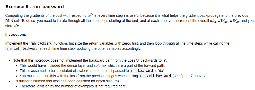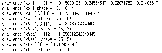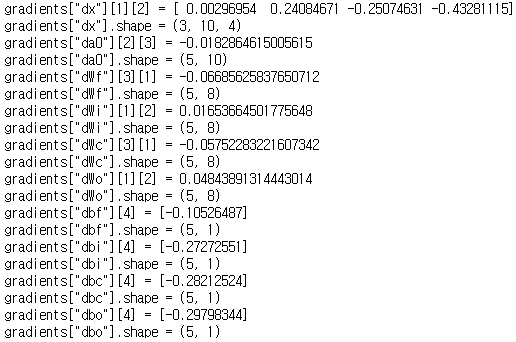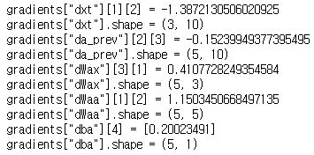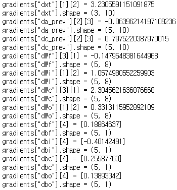 gradients = {"dx": dx, "da0": da0, "dWf": dWf,"dbf": dbf, "dWi": dWi,"dbi": dbi,