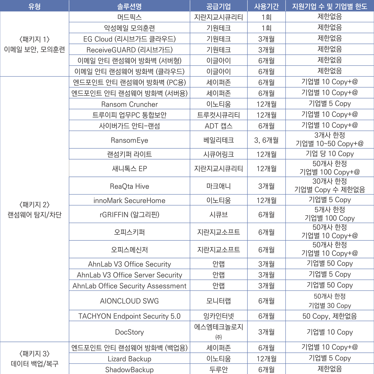| 특이사항 | 각 공급기업이 제공하는 랜섬웨어 솔루션의 사용기간, copy 등을 고려하여 선택하게 됩니다. |
