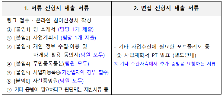 - 기창업자의 경우 사업장 소재지가 서울이면 참가 가능하나, 팀 대표가 서울 거주자로서, 팀원의 50% 이상이 서울시 거주 청년의 기준에 부합해야 함
