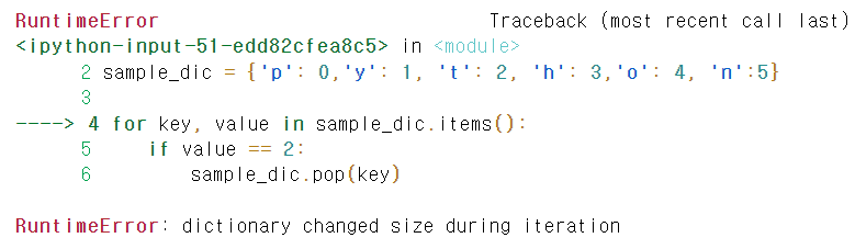 for, while loop에 의해 dictionary를 삭제하게 되면, 이에 따라 dictionary의 크기가 변하여 생기는 에러 입니다.