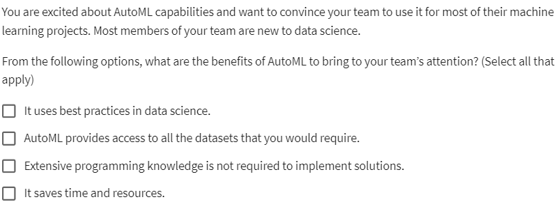 "Analyze Datasets and Train ML Models using AutoML"의 강의를 통해 'exploratory data analysis (EDA), automated machine learning (AutoML), and text classification algorithms에 대해서 배우게 됩니다. 강의는 아래와 같이 구성되어 있습니다.