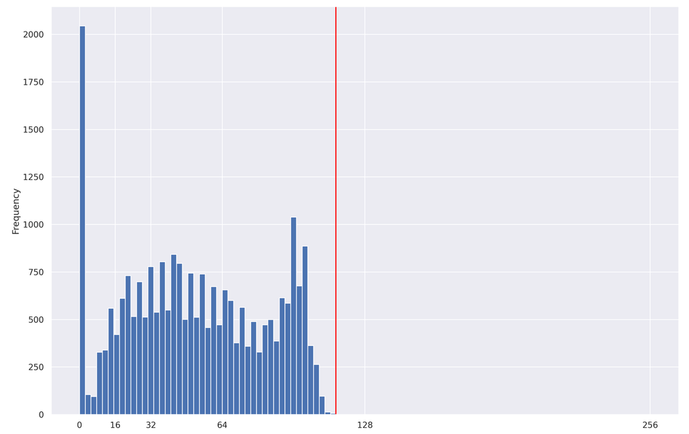 Since a smaller max_seq_length leads to faster training and lower resource utilization, you want to find the smallest power-of-2 that captures 100% of our reviews. For this dataset, the 100th percentile is 115. However, it's best to stick with powers-of-2 when using BERT. So let's choose 128 as this is the smallest power-of-2 greater than 115. You will see below how the shorter sentences will be padded to a maximum length.