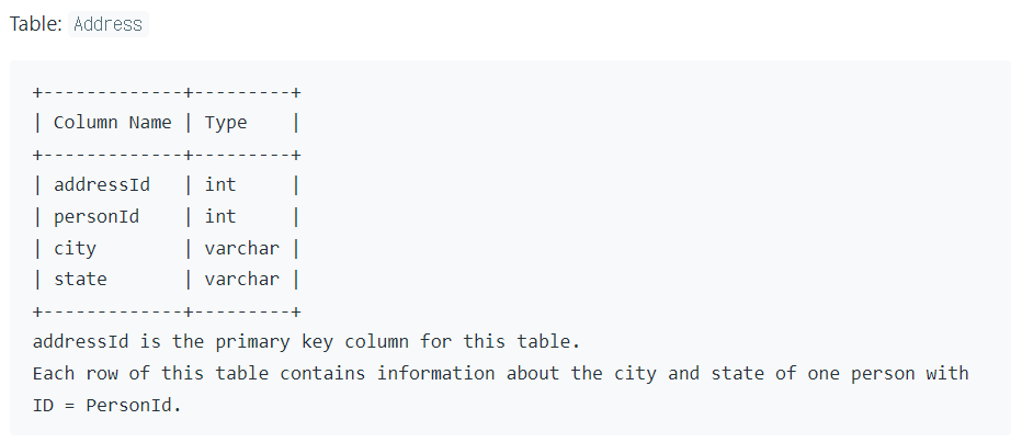주어진 2개의 테이블 중에서, Person 테이블을 기준으로 Address와 연결해서 결과를 반환하는 문제입니다.
